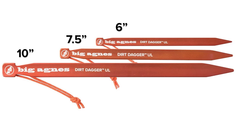 Dirt Dagger UL Tent Stakes are not your average stake. Designed with patent pending I-Beam aluminum construction for a stronger stake-out to keep your tent or shelter in place and to keep you safely protected from the elements. Our lightest and strongest stakes ever, youll notice the difference with a 25% increase in strength to weight ratio when youre staking out or tugging the cord loop pull to pack up. Available in select tent models and sold separately in three sizes, 6 for crazy and ultralight tents, 7.5 for superlight setups, and 10 for car camping and shelters. Grab an extra set for your gear cache or gift one to your favorite camper, the Dirt Dagger UL Tent Stakes will make all the difference at camp.![]()